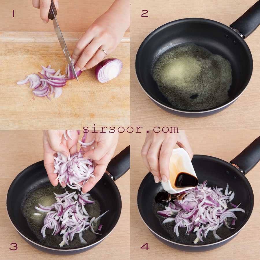 يك تابه متوسط برمیداريم، ١٠ گرم از كره را در آن میريزيم، پياز، بالزاميك، سس سويا و آب را اضافه میكنيم.