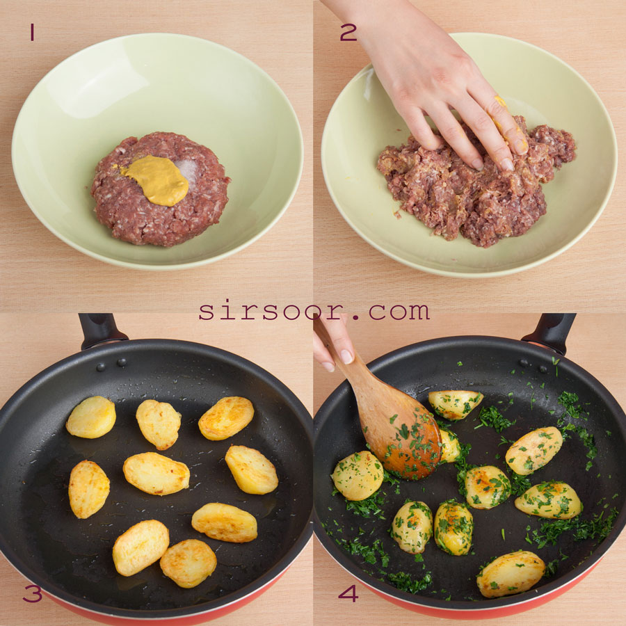 در يك تابه كمیروغن ريخته و سيبزمينيها را سرخ میكنيم سپس روغن اضافي را خالي كرده، ده گرم ديگر از كره را به سيبزميني اضافه كرده، نمك میزنيم و سي ثانيه تفت میدهيم. جعفري را افزوده، تابه را در فر میگذاريم تا گرم بماند.