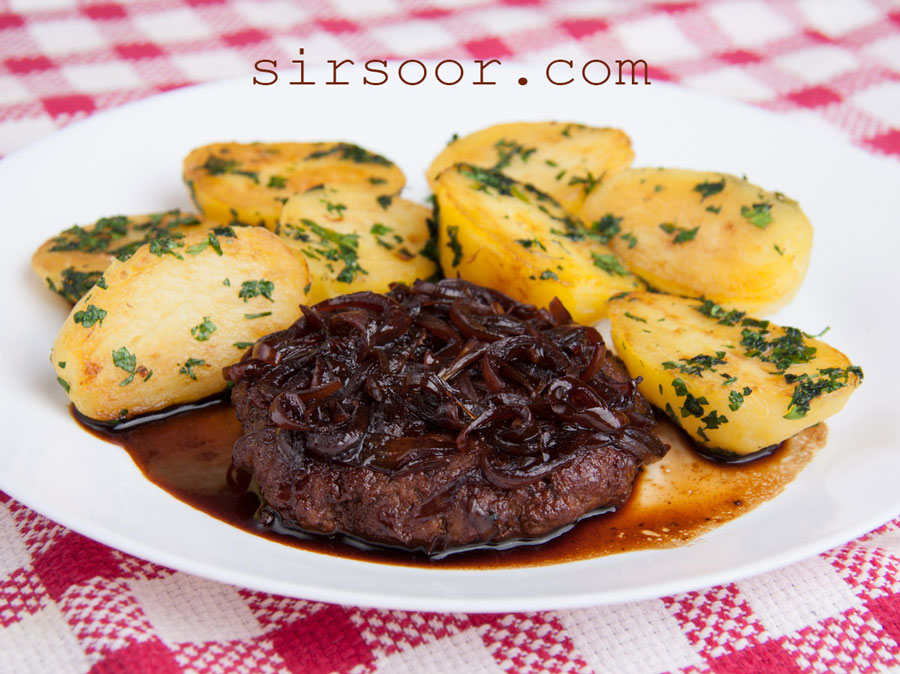 سس پياز را به برگرها اضافه كرده میگذاريم تا به جوش بيايد سپس از روي آتش برداشته باقيمانده كره را اضافه میكنيم تا آب شود. برگرها را با سس و سيبزميني سرخ شده سرو میكنيم.