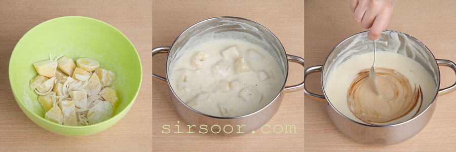 خامه را بيفزاييد، هم بزنيد، حرارت را كم كنيد و بگذاريد تا براي نيم ساعت بپزد. در قابلمه را نگذاريد. گاهي هم بزنيد.