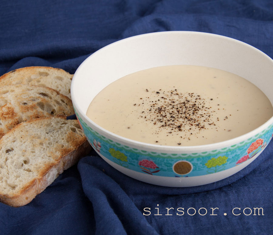 مواد را از روي حرارت برداريد و با گوشت كوب برقي له كنيد يا در مخلوط كن بريزيد.
